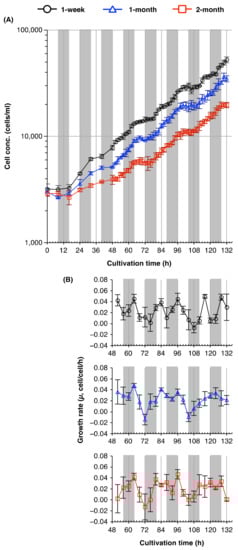 Periods of the cell division cycles of E. gracilis from young and old cultures under T16 light/dark cycles. Time courses of the (A) cell concentration and (B) growth rate (µ, cell/cell/h) of E. gracilis cells from 1-week-old, 1-month-old, and 2-month-old cultures under T16 cycles. E. gracilis cells were cultured under T24 cycles for 1 week, 1 month, or 2 months, and subsequently inoculated into fresh medium. Cells were collected every 2 h for 3.5 days from 48 h post-inoculation in order to enable measurement of cell concentration; growth rates were calculated over 4-h intervals. Data are means ± SD (n = 3).