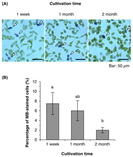 Viability of E. gracilis cells from young and old cultures. (A) Appearances of E. gracilis cells from 1-week-old, 1-month-old, and 2-month-old cultures stained with 0.04% methylene blue (MB). Arrowheads indicate MB-stained cells. (B) Percentages of MB-stained cells in the populations after washing prior to inoculation. Data are means ± SD (n = 3). Bars labeled with the same letter do not differ significantly from each other (Tukey’s multiple range test, p < 0.05).