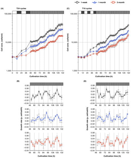Rhythms of the cell division cycle of E. gracilis from young and old cultures exposed to T16 cycles. Time courses of (A,C) cell concentration and (B,D) growth rate (µ, cell/cell/h) of E. gracilis cells from 1-week-old, 1-month-old, and 2-month-old cultures under free-running conditions following entrainment to T24 and T16 cycles. E. gracilis cells were cultured under T24 cycles for 1 week, 1 month, and 2 months, and subsequently inoculated into fresh medium. Algal cells were cultured under T24 or T16 cycles for 48 h and then transferred to free-running conditions (1 h/1 h light/dark cycles) for 3.5 days. Data are means ± SD (n = 3). Growth rates under free-running conditions were calculated over 4-h intervals.