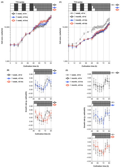 Plasticity of the period of cell division cycle of E. gracilis from young and old cultures. Time courses of the (A,C) cell concentration and (B,D) growth rate (µ, cell/cell/h) of E. gracilis cells from 1-week-old (A,B), and 1-month-old (C,D) cultures under free-running conditions beginning at different start times. E. gracilis cells were cultured under T24 cycles for 1 week and 1 month, and subsequently inoculated into fresh medium. After entrainment to 3 × T16 cycles, algal cells were irradiated for 0, 2, or 6 h, and then released to free-running conditions (1 h/1 h light/dark cycles). Data are means ± SD (n = 4). Growth rates under free-running conditions were calculated over 4-h intervals.