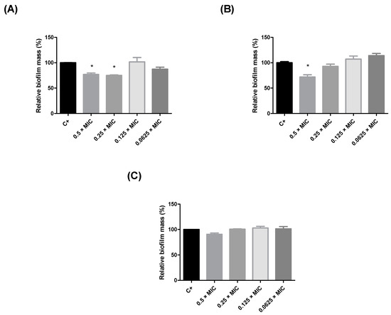 Inhibition of the biofilm formation in Staphylococcus aureus by Humiria balsamifera (Aubl) extracts. (A) HLE = hexane leaf extract, (B) EALE = ethyl acetate leaf extract, and (C) MLE = methanol leaf extract. (*) Significant differences (p < 0.05) in relation to untreated biofilm (C +).