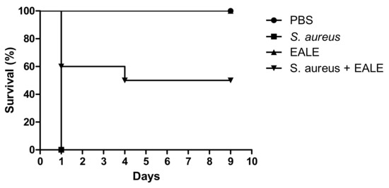 To evaluate the antimicrobial efficacy of the ethyl acetate leaf extract (EALE), the selected method was an alternative infection model based on the S. aureus ability to infect T. molitor larvae (Figure 2). The group infected with a lethal dose of S. aureus with no treatment presented an average lifespan of 1 day. In contrast, the uninfected larvae inoculated with the extract or its vehicle did not show a decrease in their lifespan. The EALE treatment was able to extend the average lifespan of the larvae (6.5 days), and by the end of the evaluation period, 50% of all larvae in this group were still alive.
