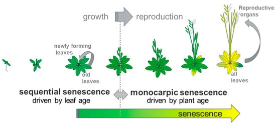 Senescence in plants is often described as the last step in the life history of a plant. However, senescence takes place from early on throughout development and a plant can sacrifice older leaves for the sake of the whole plant. Leaf senescence aims at remobilizing previously acquired nitrogen, carbon and mineral resources out of the senescing tissue into developing parts of the plant, before the leaf eventually dies and is shed. Before anthesis, sequential leaf senescence leads to the repartitioning of nutrients from older leaves to newly developing non-reproductive organs. After anthesis, monocarpic leaf senescence governs nutrient reallocation to the now developing reproductive organs and, therefore, has a very critical impact on yield. During monocarpic senescence, potentially all the leaves of a plant can undergo senescence, leading to the death of the whole plant (Figure 1).