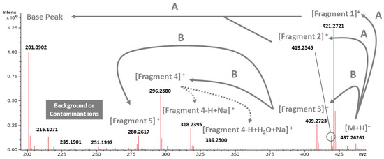 ESI-MS detected twelve ion peaks from 20-HM. Three of the peaks were assigned as background or contaminant peaks [27], and the remaining peaks (nine peaks) were proposed as a main fragmentation of 20-HM as presented in Figure 1; Figure 2 by combining a search through literature and chemical databases and a prediction from CFM-ID version 3.0 software [17,28,29]. Most of the proposed fragments were in a range of ±5 mDa from a theoretical mass calculated by ACD/Chemsketch (free version, 2015). Therefore, these fragments were accepted as an accuracy mass following a report of Watt et al. (2001) [30]. However, some ion peaks—namely a molecular ion peak, fragment 4.2, and fragment 4.2 with adduct ions—showed a difference greater than 5 mDa but less than 10 mDa. Therefore, they were still in a tolerated mass range reported by Zhang et al. (2018) [31]. A summary of the difference between theoretical and observed masses is provided in the Supplementary Material, Table S1.