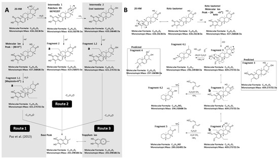 Observed ESI-MS spectrum of the obtained 20-HM and its proposed mass fragmentation. A and B indicate the mass fragmentation presenting in routes A and B from Figure 2 (below).