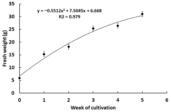 Growth curve of G. heterophylla cell suspension culture in the optimized cultivation medium. The fresh weight of the cells is monitored and presents in the mean ± SD from three replicates (n = 3). The non-linear regression (a quadratic model) is fitted with the growth curve as shown in the dotted line. The equation and R2 of the regression are also provided.