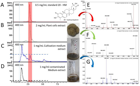 HPLC chromatograms and MS spectra of 0.5 mg/mL the standard 20-HM (A,E); 2 mg/mL G. heterophylla cells extract (B,F); 1 mg/mL cultivation medium extract (C,G); and 1 mg/mL infected medium (D). The highlighted red box indicates similar Rt values (2.8 to 2.9 min) between samples and the standard 20-HM.