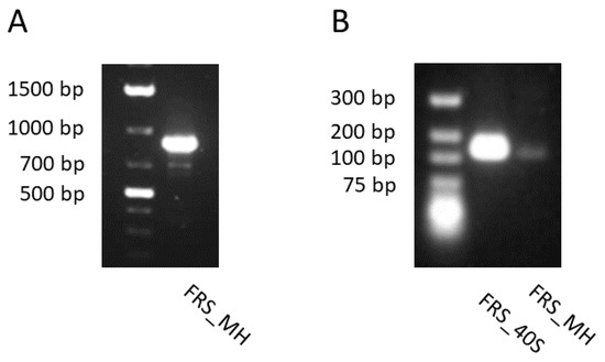 Amplified PCR product of the hypothetical FRS gene from the genomic DNA, spanning around 800 bp (A); and complementary DNA, spanning about 160 bp of G. heterophylla compares to 40S ribosomal protein as the reference gene, spanning around 160 bp (B).