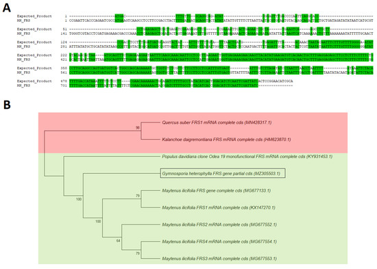 Pairwise alignment between the template PCR product of the FRS gene from M. ilicifolia and isolated PCR product of the FRS gene from G. heterophylla. Green highlights indicate the conserved bases (A); phylogenetic analysis of the obtained friedelin synthase (FRS) gene from G. heterophylla, and deposited FRS gene sequences in the NCBI database (B). This tree is deposited on the TreeBASE database (TreeBASE tree ID: tr131454). Multiple alignments are performed using the Muscle tool, and the phylogenic tree was constructed using the maximum parsimony (MP) method from MEGA-X software (Version 10.0.4). The bootstrap values are shown on the branch based on 1000 pseudoreplicates. The MP tree is obtained by applying the min-mini heuristic algorithm with a searching factor of 1. The green box indicates a shared cluster among the relevant plant species, while the red box indicates a non-related cluster of the FRS genes. A box indicates an obtained FRS gene from G. heterophylla (NCBI accession number: MZ305503.1).