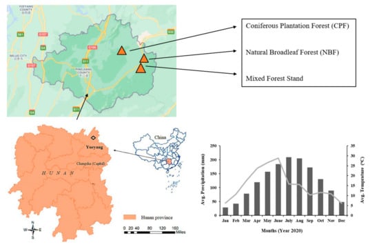 The study was conducted at the Lutou forest ecosystem observation and research Station, Pingjiang County, Yueyang, Hunan Province, China. The geographic coordinates of the research station are 113°51′52″~113°58′24″ E, 28°31′17″~28°38′00″ N (Figure 1). The total area of the research station is 4762 ha. The soil type is the same in all three forest types (Lateritic red soil). The study area is located in the humid subtropical zone. The climate of the study area is warm and humid with abundant rainfall, sufficient sunshine, and four distinct seasons. The mean annual temperature is 17.07 ℃, and the mean annual precipitation is 1312 mm, with an average humidity of 82%.