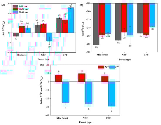 The natural abundance of (A) soil 15N (‰) and (B) soil 13C (‰) at different soil depths and (C) foliar 15N (‰) and 13C (‰) in different forest types. Values are means ±SE. The different small letters represent the significant differences between forest types, and different capital letters represent the significant difference between different soil depths p ≤ 0.05.