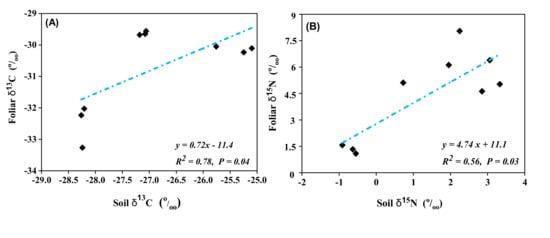 3.3. Relationship between Soil, Foliar Isotopic Abundance, and C:N Ratio