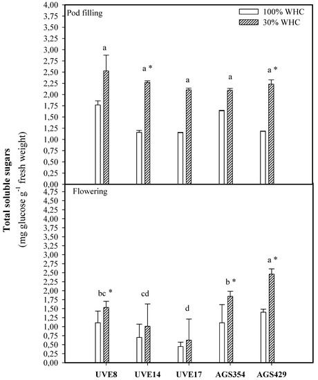 Total soluble sugar (TSS) content for five vegetable-type soybean cultivars subjected to two water treatments at flowering and pod-filling stages. Values represent means ± SD (n = 3). Letters represent significant differences/similarities in TSS content for various cultivars under severe water stress at 30% water holding capacity (WHC), * represents significance at p ≤ 0.05.