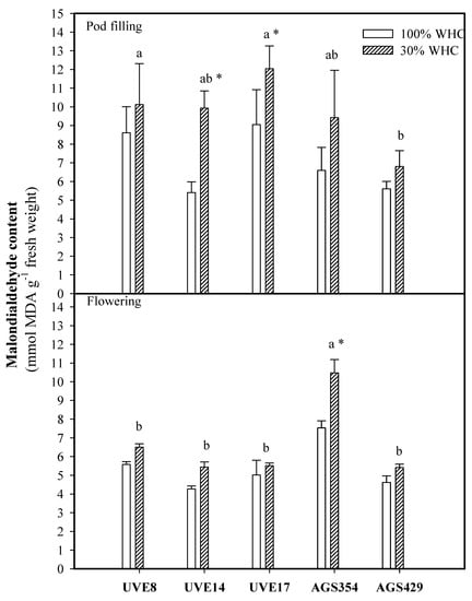 Malondialdehyde (MDA) content for five vegetable-type soybean cultivars subjected to two water treatments at flowering and pod-filling stages. Values represent means ± SD (n = 3). Letters represent significant differences/similarities in MDA content for various cultivars under severe water stress at 30% water holding capacity (WHC), * represents significance at p ≤ 0.05.