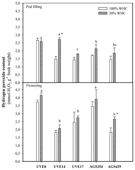 Hydrogen peroxide contents for five vegetable-type soybean cultivars subjected to two water treatments at flowering and pod-filling stages. Values represent means ± SD (n = 3). Letters represent significant differences/similarities in H2O2 content for various cultivars under severe water stress at 30% water holding capacity (WHC), * represents significance at p ≤ 0.05.