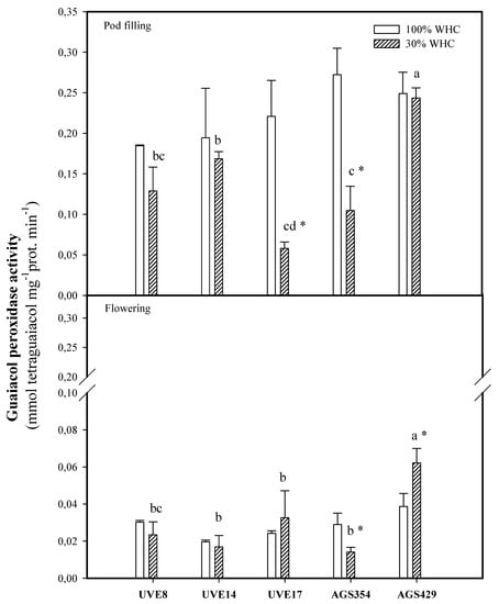 Guaiacol peroxidase (GPX) activity for five vegetable-type soybean cultivars subjected to two water treatments at flowering and pod-filling stages. Values represents means ± SD (n = 3). Letters represent significant differences/similarities in GPX activity for various cultivars under severe water stress at 30% water holding capacity (WHC), * represents significance at p ≤ 0.05.