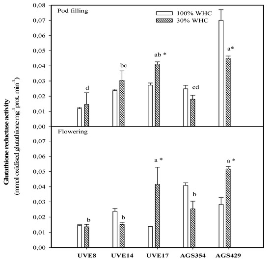 Glutathione reductase (GR) activity for five vegetable-type soybean cultivars subjected to two water treatments at flowering and pod-filling stages. Letters represent significant differences/similarities in GR activity for various cultivars under severe water stress at 30% water holding capacity (WHC), * represents significance at p ≤ 0.05.