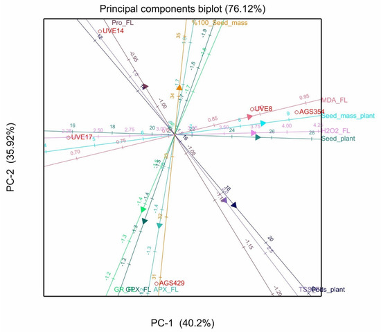 Principal components biplot between PC1 and PC2 showing the contribution of biochemical and yield parameters to the variability of five vegetable-type soybean cultivars subjected to severe stress at flowering.