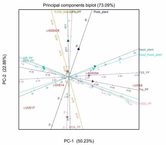 Principal components biplot between PC1 and PC2 showing the contribution of biochemical and yield parameters to the variability of five vegetable-type soybean cultivars subjected to severe stress at pod filling.