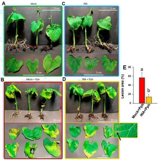 Phenotypic damage caused by the virulent bacteria P. syringae pv. phaseolicola (Pph) in common bean plants. Entire plants and extended leaves are shown to compare symptoms in Mock (A,C) and INA-pre-treated plants (B,D), non- (A,B) or Pph-inoculated (C,D). In panel D, a detail of the observed necrotic spots indicative of hypersensitive response (pointed by an arrow) is shown. (E) Quantification of the lesion area. Data represent mean ± SE (n = 6) and statistically differences, indicated by letters, were achieved according to t-Student test (p < 0.05). Pictures correspond to one experiment representative of three independent ones with similar results.