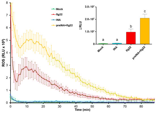 Reactive oxygen species (ROS) production in bean leaf-disks subjected to different treatments: water (Mock, green line), 100 μM INA (INA, blue line), 1 μM flg22 (flg22, red line), or 1 μM flg22 after pre-treatment with 100 μM of INA (preINA + flg22, yellow line), and measured as relative light units (RLU) produced by Luminol reaction over the time. Total areas under the curves were integrated, and resultant values are represented at the right side of the panel. Data represent mean ± SE (n = 8) from one experiment representative of three independent ones with similar results. Statistically significant differences, indicated by letters, were achieved according to one-way ANOVA (p < 0.05), by post hoc Tukey test.