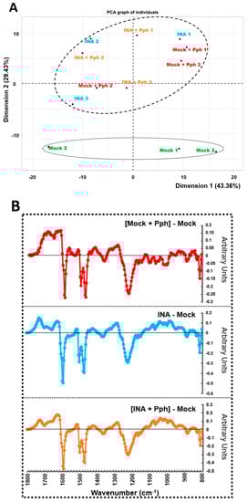 Cell wall fingerprinting. (A) Principal Component Analysis obtained from FTIR spectra of crude cell walls extracted from leaves of Mock, Mock + Pph, INA, and INA + Pph common bean plants. Each dot represents a biological replicate obtained in each of the 3 independent experiments carried out. PCA is plotted with dimensions 1 and 2, which explained the 43.36% and 29.43% of the total variance, respectively. (B) Average FTIR difference spectra obtained by digital subtraction of the Mock CW spectra from the CW spectra of the other treatments.