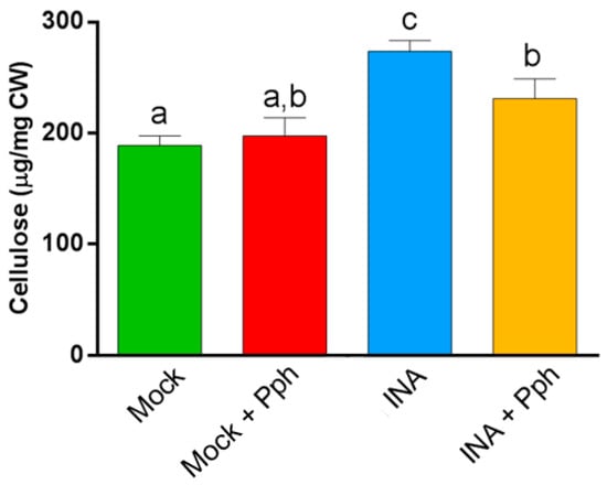 To deepen into the CW changes after the Pph inoculation and the INA priming, the cellulose content was measured in crude CWs. It should be taken into account that cellulose, a major CW component, has been described to participate in defense and remodeling [20]. Besides, our results indicate that cellulose contributes to discriminate among treatments after PCA of FTIR CW spectra (Table 1). Updegraff methodology confirmed that the INA pre-treatment resulted in an increased crystalline cellulose content in both INA and INA + Pph plants, which could indicate a CW reinforcement after priming, due to the fact that the simple Pph inoculation of Mock did not alter the cellulose content significantly (Figure 4).