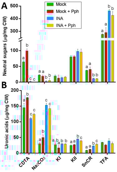Thereafter, the fractions were subjected to acid hydrolysis, and neutral sugar composition was determined by gas chromatography (Figure 6). After the INA pretreatment, no neutral sugars were detected in CDTA and Na2CO3 fractions, probably due to an increment in the uronic acid to neutral sugar proportion in these fractions (Figure 5), which makes the neutral sugar quantification difficult [62]. In these pectin-enriched fractions (Figure 6A,B), the Pph inoculation produced increments in rhamnose (Rha) and arabinose (Ara) concentrations, most likely arising from RG-I. Additionally, Ara and galactose (Gal) also increased in SnCR and TFA fractions in Mock + Pph (Figure 6E,F), pointing also to an enrichment in arabinogalactans.