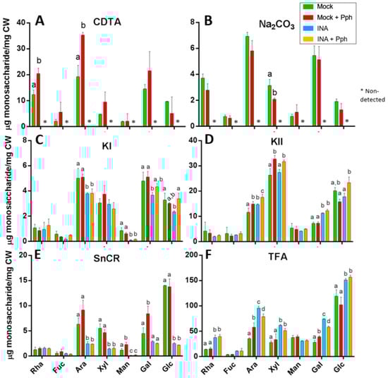 Monosaccharide analysis from different CW fractions: CDTA (A), Na2CO3 (B), KI (C), KII (D), SnCR (E), and TFA (F) of Mock, Mock + Pph, INA, and INA + Pph common bean plants. Monosaccharides are referred as Rha: rhamnose, Fuc: fucose, Ara: arabinose, Xyl: xylose, Man: mannose, Gal: galactose and Glc: glucose. Data represent mean ± SE (n = 3). Statistical analysis was carried out by t-student for Figure A and B, and by one-way ANOVA for Figure C to F where letters indicate differences by Tukey test (p < 0.05). Asterisks refers to non-detected monosaccharides.