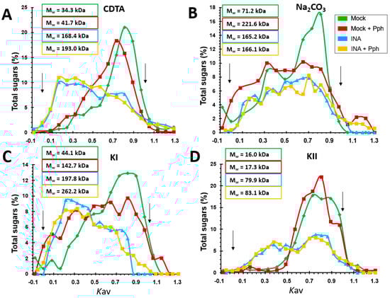 Relative mass distribution profiles of CDTA (A), Na2CO3 (B), KI (C), and KII (D) fractions extracted from CWs of Mock, Mock + Pph, INA and INA + Pph. 0 and 1 Kav were assigned to blue dextran and sucrose markers, respectively (indicated with arrows). The average molecular weight in kDa (Mw) obtained by Kav(1/2) method is shown inserted in boxes.