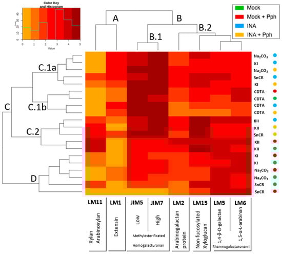 Heatmap of data obtained from IDAs of fractioned CW from Mock, Mock + Pph, INA and INA + Pph conditions. The value assigned from 0 to 5, depending on the marked dilution after development, is represented in a color key for the 5 levels. Fractions of each treatment are clustered in the horizontal axis, while monoclonal antibodies are clustered in the vertical axis. For easy visualization, the next clusters were established with respect to antibodies clusterization: cluster A, grouping LM1 and LM11; cluster B, divided into B.1, containing JIM5 and JIM7, and B.2, where LM5, LM6, LM2 and LM15 were included. Regarding fractions and treatments, the clusters obtained were: cluster C, divided into C.1a (relative to Na2CO3 and KI fraction of INA treatments), C.1b (where all CDTA fractions were located), and C.2, with KII fractions mostly; cluster D, relative to Na2CO3 and KI fraction but of Mock and Mock + Pph.