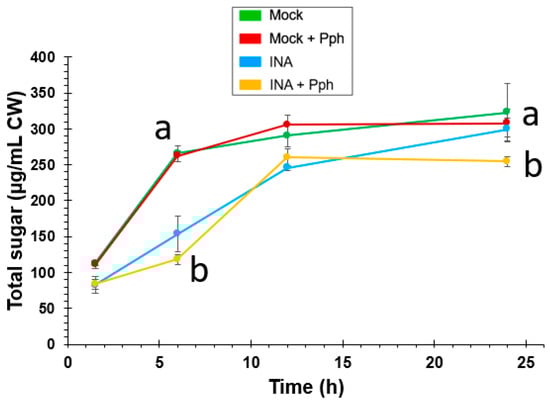 Time course of sugars released by enzymatic hydrolysis of CWs extracted from Mock, Mock + Pph, INA and INA + Pph conditions. Data represent mean ± SE (n = 3). Statistical analysis was carried out by two-way ANOVA where letters indicate significant differences by Tukey test (p < 0.05).