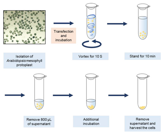 We first isolated Arabidopsis mesophyll protoplasts (AMPs) and transfected DNA using a previously described method [28,38]. Subsequently, the cells were placed in 1.5 mL tubes at a volume of approximately 1 mL. To induce mechanical damage in AMPs, the transfected cells were vigorously vortexed for 10 s and were allowed to stand for 10 min to precipitate at the bottom of the tube. Thereafter, 800 μL supernatant was removed from the tube to reduce hypoxia, and the cells were then incubated. After incubation, the supernatant was completely removed, and the cells were harvested (Figure 1).