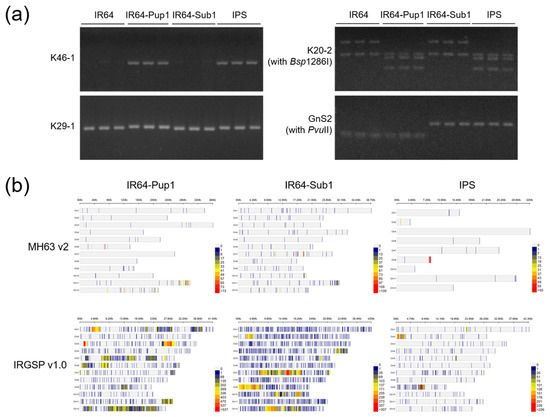 The IPS plants were identified by background genotyping using an Axiom Oryza 580 K chip set, which consists of SNP markers designed on the basis of Minghui63 v2 (MH63 v2; indica variety) and IRGSP v1.0 (japonica variety) (Figure 1b). The non-IR64 alleles in IR64-Pup1, IR64-Sub1, and IPS were marked on each position of the chromosome by colored lines, representing the number of polymorphism markers. The percentage of IR64 allele in IR64-Pup1 and IR64-Sub1 reached 95.8% and 97.6% based on IRGSPv1.0, and 96.3% and 96.8% based on MH63 v2. The ratio of IR64 allele in IPS was 99.7% and 99.5% based on IRGSPv1.0 and MH63 v2, respectively. The non-IR64 alleles were not detected on chromosome 3, 5, and 8 of IPS based on MH63 v2.