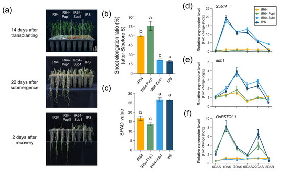 Phenotypic analysis of IR64, IR64-Pup1, IR64-Sub1, and IPS under submergence. (a) Phenotypic evaluation of plants after 22 days of submergence and 2 days of de-submergence. (b) Plant height. (c) The SPAD value of rice leaves. (d–f) Relative gene expression level of Sub1A, adh1, and OsPSTOL1, the major genes of Sub1, anaerobic respiration, and Pup1, in shoots were analyzed. Expression was calculated using relative quantification, normalized to OsUBQ5 transcript abundance, and expressed in relation to IR64 as a calibrator sample. n = 3. The letters above the bars represent statistical significance (p < 0.01) as measured by Duncan’s multiple range test.