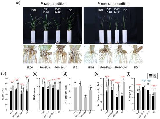 Phenotypic analysis of IPS, IR64, IR64-Pup1, and IR64-Sub1 under different phosphorus conditions 48 days after transplanting (DAT). (a) The phenotype of plants that were grown under P-sup. and P-non-sup. conditions, respectively. (b,c) Plant height and SPAD value. (d) Tiller numbers per plant under P-sup. condition. (e) Crown root number per plant and (f) root length. Colored numbers above the bars represent phenotypic change rates under P-sup. versus P-non-sup. conditions. Red/blue means an increase/decrease in each value under P-non-sup. condition. The letters above the bars indicate statistically significant differences (p < 0.01) as measured by Duncan’s multiple range test; values with different letters in the same-colored column are significantly different (*** significant at p < 0.001, * p < 0.05, ns: no significant difference).