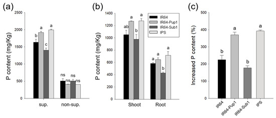 The total P content in the whole plant of Pup1-introgression lines (IR64-Pup1 and IPS) was significantly higher than that of Pup1-non-introgression lines (IR64 and IR64-Sub1) in P-sup. condition, while there were no differences among NILs in P-non-sup. condition (Figure 4a). In addition, the total P content in the shoots and roots of Pup1-introgression lines (IR64-Pup1 and IPS) was higher than for IR64-Sub1 (Figure 4b). The increased P content ratio of P-sup. condition to P-non-sup. condition was 392.4% and 369.8% for IPS and IR64-Pup1, respectively, which was significantly higher than that of IR64 (224.9%) and IR64-Sub1 (177.2%) (Figure 4b,c). From these results, Pup1 was assumed to be functioning compatibly with Sub1 to increase P uptake in the soil system under sufficient phosphorus conditions.