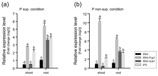 The gene expression level of OsPSTOL1 was analyzed for all NILs grown under P-sup. and P-non-sup. conditions (Figure 5a,b). Plants were grown under mild drought condition to assess Pup1 function properly. We used 14-day-old plants for RNA extraction since the RNA transcription level increased prior to the morphological changes. The OsPSTOL1 expression level in Pup1-introgression lines (IR64-Pup1 and IPS) was higher than that in Pup1-non-introgression lines (IR64 and IR64-Sub1) in both P-sup. and P-non-sup. conditions. The OsPSTOL1 expression was detected in the roots of IR64-Sub1 under both P conditions; however, the amplicon turned out to be false positive by agarose gel electrophoresis (Figure S2). IR64-Pup1 displayed the highest expression level in the shoots and roots in both P-sup. and P-non-sup. conditions (Figure 5a,b). The expression levels in the shoots and roots of IR64-Pup1 were 2.67 and 5.45 in P-sup. condition, but 10.35 and 6.50 in P-non-sup condition, respectively. OsPSTOL1 expression in the shoots of IR64-Pup1 was significantly higher than in other NILs in P-non-sup. condition. The OsPSTOL1 expression level of IPS was significantly lower than that of IR64-Pup1 in both shoots and roots, regardless of P conditions. It was assumed that the Sub1 QTL or introgressed segment interfered with the function of Pup1 QTL of IPS under mild drought condition.
