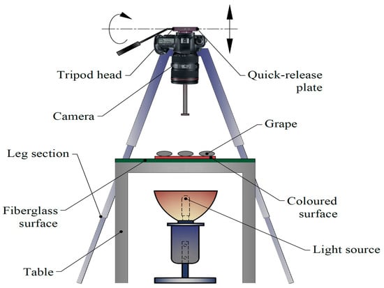 As presented in Figure 1, 10 different grape varieties (‘Ata Sarısı’, ‘Barış’, ‘Dımışkı’, ‘Hatun Parmağı’, ‘Helvani’, Horoz Karası’, ‘Hönüsü’, ‘İtalia’, ‘Mevlana Sarısı’, and ‘Red Globe’) were used in this study. A randomly selected 40 samples were used for the image processing purposes of each variety. Sampled berries were imaged on white color fiberglass plates, supplemented with artificial lighting beneath for clear images [36] and a transparent surface to provide a contrast between plate and grape color. Samples were arranged in 4 × 5 matrix of 2 groups. Samples fixed with cylindrical plastic supports were imaged at horizontal and vertical orientations, with the use of Nikon D90 model digital camera and the resultant images were saved in *.tiff files. The schematic diagram of the imaging system, with a digital camera mounted on a tripod allowing imaging from 56 cm above the samples, is presented in Figure 2. An external shutter release button was used to prevent vibrations while imaging. A millimetric ruler was used to convert pixel units into metric units.
