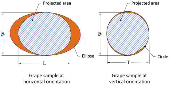 To determine the dimension and shape traits of the grape varieties, SigmaScan Pro v.5.0 software was used. Thresholding was applied to monochrome images in the range of 0–255, and dimension analysis was conducted automatically. The length (L, mm), width (W, mm), thickness (T, mm), projected area (PA, mm2), equivalent diameter (ED, mm), perimeter (P, mm), and circularity (C) values were measured. The measured dimension and shape traits are provided in Figure 3, and the equations used to calculate these values are provided in Table 1.