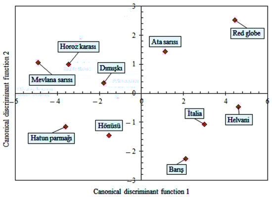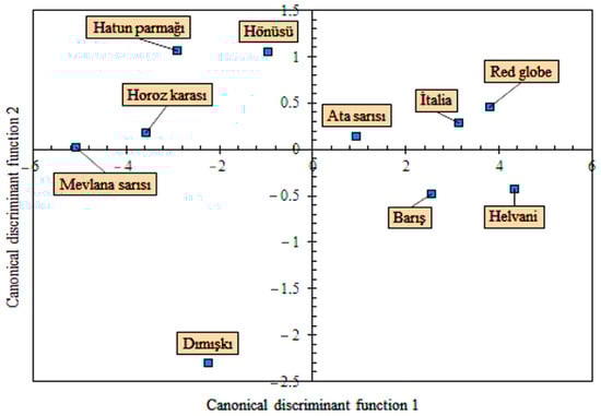 In Table 5, the size and shape traits of grape varieties were classified with 9 discrimination functions. The first function explains 65.7% of the total variance, and the second function explains 12.3%. According to the canonical correlation coefficients, the difference between the groups can be explained by 95.8% of the first function and 82.4% of the second function. According to the results of MANOVA and Hotelling’s pairwise comparison, the grape varieties differ from each other, according to the size and shape traits. However, in paired comparisons, the affinities between the varieties can be examined according to Mahalanobis distances. The smaller the distance value, the higher the similarity rate between varieties. The classification performance of the discrimination functions is 80.8%. Although there are significant differences between the varieties, according to their size and shape traits, the varieties with similar characteristics are clearly seen in the table. For example, the correct classification rate of the ‘Mevlana yellow’ variety, by the discrimination function, is 70%. However, this grape variety has similar characteristics with the ‘Horoz Karası’ and ‘Hatun Parmağı’ varieties. It is seen that the Mahalanobis distances of both varieties are smaller than the other varieties.