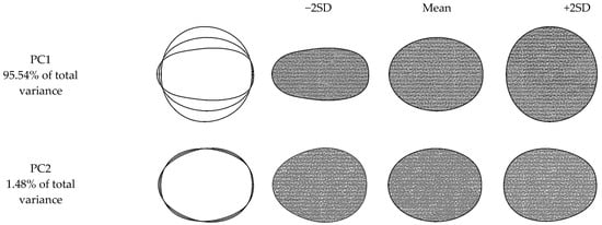 The results of elliptic Fourier analysis are presented in Figure 5. Two principal components explained 97.02% of the total variation in the shapes of the grape varieties. PC1 explained 95.54% of the total variation. Shape differences, the majority of which were explained by PC1, were mainly attributed to ellipse and sphere-looking varieties. Similar findings were also reported by Bodor et al. [35] for five different grape genotypes. PC2 explained only 1.48% of the total variation in the shapes of the grape varieties. Considering the shape variation of PC2, it was observed that there were drop-like varieties, apart from ellipse and sphere geometries.