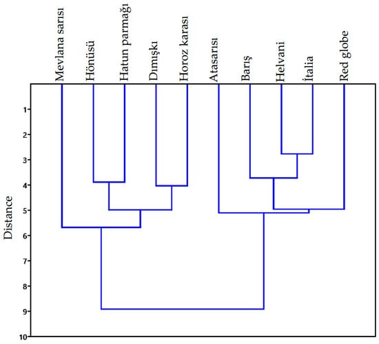Dendrogram of 10 grape varieties for the discriminant scores obtained from the size and shape data, and principle component scores of the elliptic Fourier analysis using hierarchical cluster analysis (between-group linkage method and Euclidean distance).