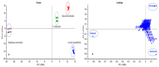 Principal Component Analysis score plot (A) and loading plot (B) of GC-MS analysis of essential oils of different Apiaceae species based on the identification of compounds shown in Table 1. E. allioides (EA), E. polycarpa (EP), F. clemaditifolia (FC), and H. intermedia (HI).