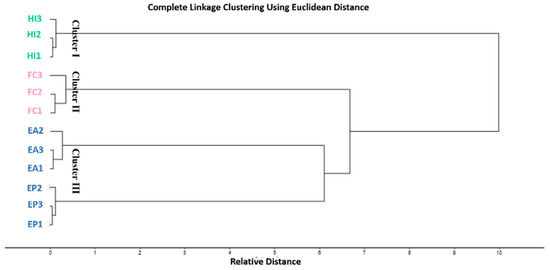 HCA clustering was performed to have a better insight into species classification. Figure 2 shows the HCA dendrogram for GC fingerprints. HCA dendrogram clustered Apiaceae species into three main clusters. Cluster I, II, and III displayed F. clemaditifolia, H. intermedia and E. allioides, E. polycarpa, respectively. The dendrogram confirmed the results obtained from PCA, revealing the similarity of E. allioides and E. polycarpa as both grouped in one cluster.