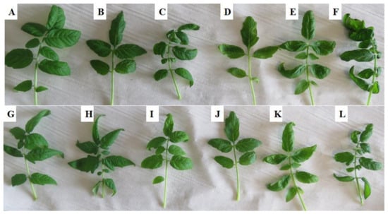 Ph. capsici is a hemibiotrophic microorganism involving a biotic trophic phase while establishing infection and a necrotrophic phase, which kills the host plant [,,]. Two days post-PGPR inoculation, the plants were infected with Ph. capsici and progression of symptoms were monitored. Previous studies have shown that symptom progression involves ascending wilting, stem rot and canopy wilting [,]. In the companion paper [] (conducted under the same conditions, but executed as a separate study with no overlapping data), symptoms were observed four to eight days post infection, with day 8 showing completely diseased plants. Here, PGPR-primed plants showed either reduced or no infection upon inoculation with Ph. capsici during the period 2–8 d.p.i. (Figure 1). In the case of Ps. fluorescens primed-Ph. capsici challenged plants, signs of wilting on the edges of leaves were observed at 8 d.p.i. (Figure 1F), whereas Pa. alvei primed and Ph. capsici challenged plants displayed no sign of wilting on 8 d.p.i. (Figure 1L). No yellowing or wilting was observed on the primed-unchallenged control plants. Thus, the results demonstrate that PGPR-inoculation leads to biochemical changes within the tomato plants, phenotypically observable as induced resistance against Ph. capsici.