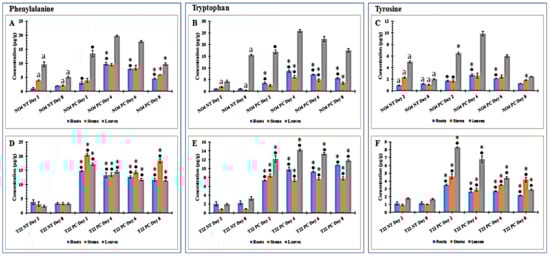 Changes in aromatic amino acids in PGPR primed tomato plant tissues harvested at different time points following Phytophthora capsici inoculation. (A–C) Pseudomonas fluorescens N04 primed-unchallenged (NT) vs. Ps. fluorescens primed-challenged (PC), (D–F) Paenibacillus alvei T22-primed-unchallenged vs. Pa. alvei primed-challenged. All concentrations are expressed as µg/g fresh weight (FW). Non-treated (NT) controls at the start (day 2) and end (day 8) of the time series were included. Comparing the PGPR-primed-unchallenged plants and the primed-infected plants, a dot (•), asterisk (*) or letter (a) indicates the statistical significance (ANOVA followed by Tukey post-hoc test at a p-value < 0.05) (Table S5): • indicates a comparison between NT day 2 and the various primed-challenged plants on days 2–8 and * indicates a comparison between NT day 8 and the various primed-challenged plants on days 2–8. The letter “a” indicates a statistically significant difference between the NT controls on days 2 and 8. The results show a time-dependent differential reprogramming of aromatic amino acid levels by Ph. capsici in the various tissues.