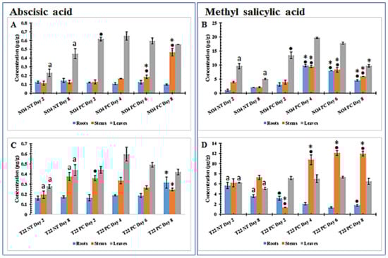 Changes in abscisic acid (A,C) and methyl salicylic acid (B,D) in PGPR-primed tomato plant tissues harvested at different time points following Phytophthora capsici inoculation. (A,B) Pseudomonas fluorescens N04 primed-unchallenged (NT) vs. primed-challenged (PC), (C,D) Paenibacillus alvei T22-primed-unchallenged vs. primed-challenged. All concentrations are expressed as µg/g fresh weight (FW). An asterisk (*) or a dot (•) or letter (a) indicates the statistical significance (ANOVA followed by Tukey post-hoc test) with a p-value < 0.05 (Table S5), comparing the PGPR-primed-unchallenged plants and the primed-infected plants. • indicates a comparison between NT day 2 and the primed-challenged plants on days 2–8 and * indicates a comparison between NT day 8 and the primed-challenged plants on days 2–8. The letter “a” indicates a statistically significant difference between the NT controls on days 2 and 8. One-way ANOVA comparing mean values of quantified phytohormones in PGPR-primed-unchallenged vs. PGPR-primed-challenged tomato plant tissues is presented in Table S1.