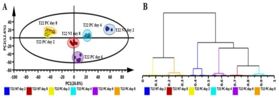 Unsupervised statistical modeling of leaf data comparing plants primed by Paenibacillus alvei T22 and primed and challenged with Phytophthora capsici. (A) A principal component analysis (PCA) scores scatter plot of all the samples, including the QC samples, colored according to time points: T22 NT, day 2 (blue) and day 8 (brown) and T22 inoculated and PC treated, days 2 (yellow), 4 (teal), 6 (purple) and 8 (orange). The PCA model presented here was a 7-component model, with R2 of 0.739 and Q2 of 0.664. (B) The hierarchical cluster analysis (HiCA) dendrogram corresponding to (A). Unsupervised statistical analysis is used to generate subgrouping of samples based on similar observations in (A) while the HiCA dendrogram shows the hierarchical relationship between samples (B). Data were acquired in (–) electrospray ionization mode.