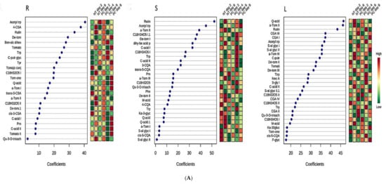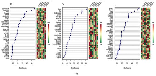 (A) Coefficient scores derived from the partial least squares discriminant analysis (PLS-DA) displaying discriminant features. Shown are annotated metabolites in primed-unchallenged (Paenibacillus alvei T22) and primed-challenged (Phytophthora capsici, PC) plant tissues for root (R), stem (S) and leaf (L) tissues. Selected metabolites (coefficient scores ≥ 2) from primed-unchallenged plants (NT days 2 and 8) were compared to those in primed-challenged plants at the given time point (PC—2, 4, 6, 8 d.p.i.). The abbreviated names of the annotated metabolites are listed in Table S6. (B) Coefficient scores derived from the partial least squares discriminant analysis (PLS-DA) displaying discriminant features. Shown are annotated metabolites in primed-unchallenged (Pseudomonas fluorescens N04) and primed-challenged (Phytophthora capsici, PC) plant tissues for root (R), stem (S) and leaf (L) tissues. Selected metabolites (coefficient scores ≥ 2) from primed-unchallenged plants (NT days 2 and 8) were compared to those in primed-challenged plants at the given time point (PC—2, 4, 6, 8 d.p.i.). The abbreviated names of the annotated metabolites are listed in Table S6.